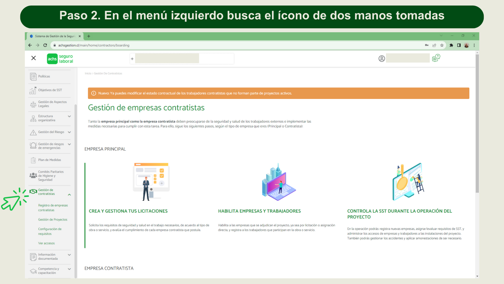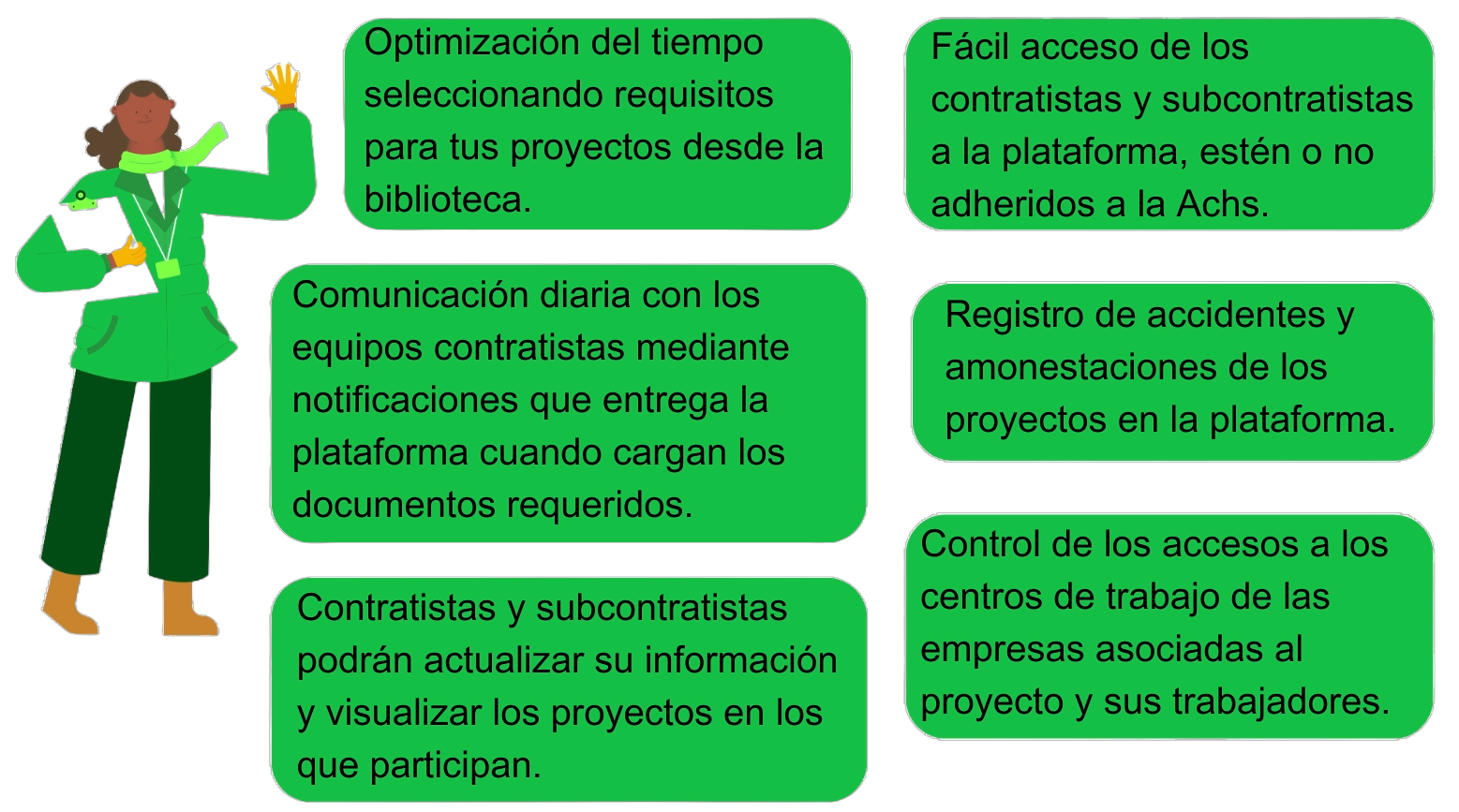 La empresa principal podrá crear y gestionar sus licitaciones, habilitar las empresas contratistas con sus respectivos trabajadores, y controlar la SST durante las operaciones. Mientras que las empresas contratistas podrán participar en las licitaciones, administrar los requisitos de SST, y gestionar los accidentes que ocurran durante los proyectos.