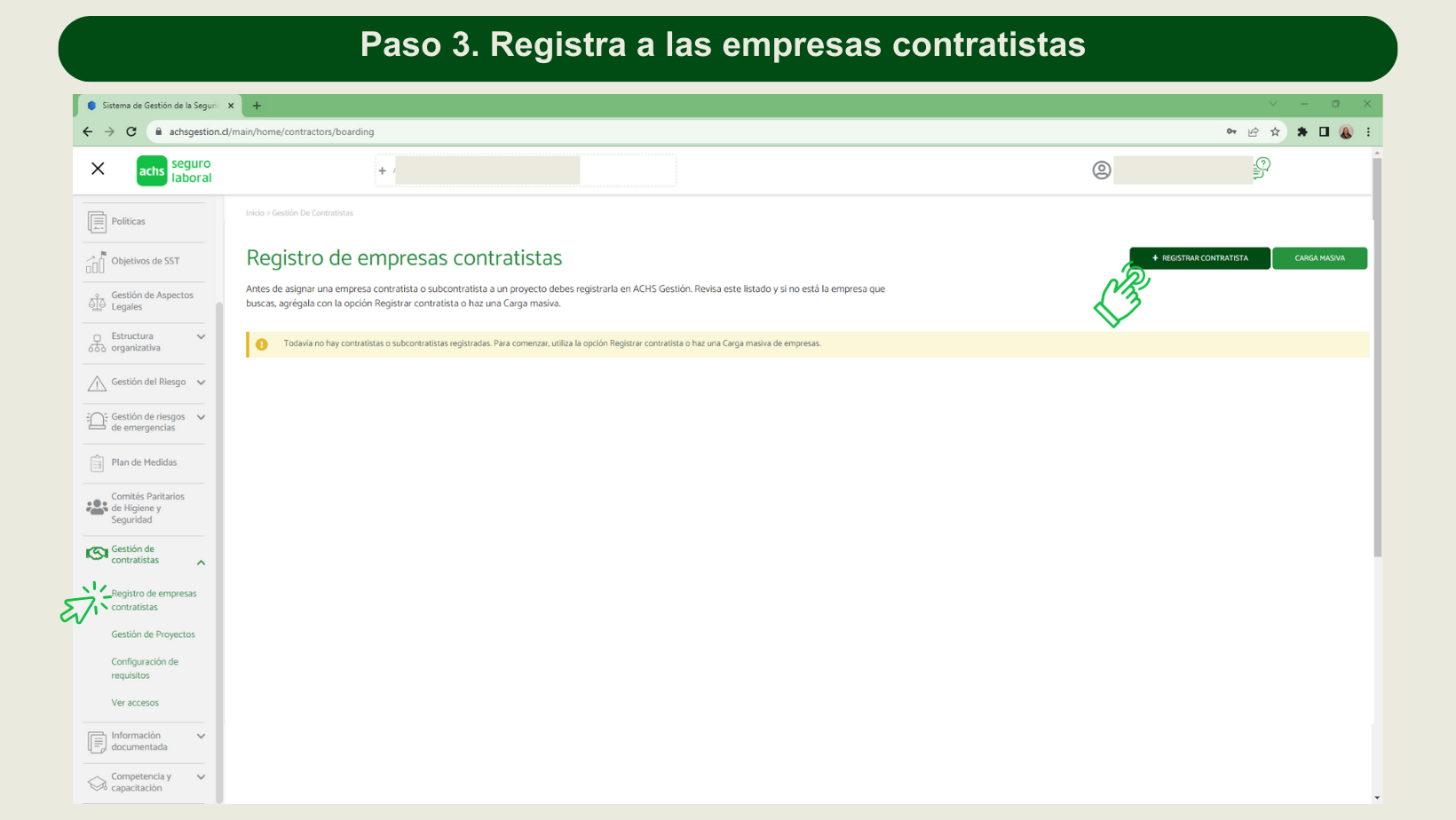 Paso 3. Registra a las empresas contratistas en el submódulo "Registro de empresas contratistas" dando clic sobre el botón "Registra contratista" que se encuentra en la esquina superior derecha
