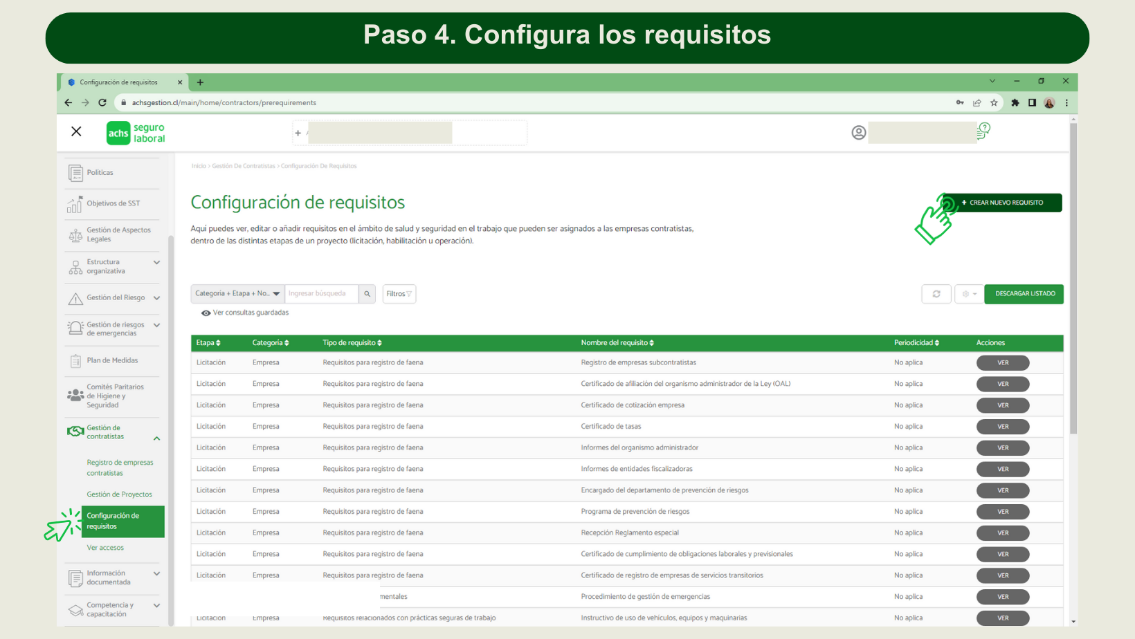 En él puedes manejar la relación con tus empresas contratistas. Te ayudará a gestionar los requisitos necesarios, en materia de Seguridad y Salud en el Trabajo, en las distintas etapas de las obras o servicios subcontratados: licitación, habilitación u operación.