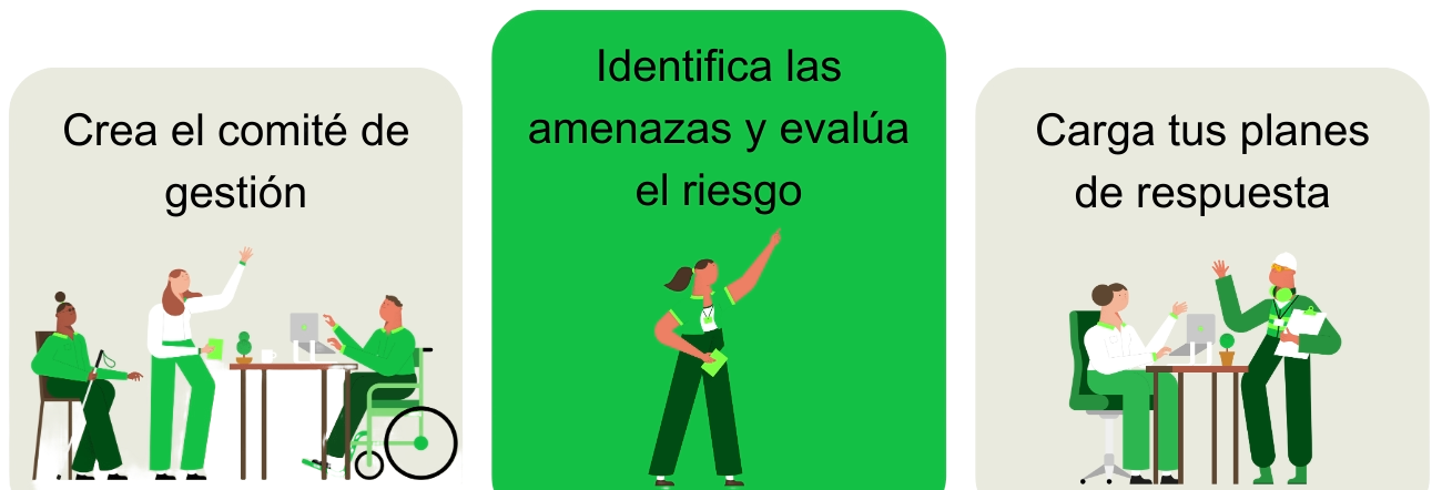 Desde el punto de vista preventivo, este proceso se compone de las etapas: organizar centros de trabajo, identificar amenazas, evaluar vulnerabilidades, crear plan de medidas y gestionar planes de respuesta, lo que podrás realizar en 3 etapas en la plataforma: